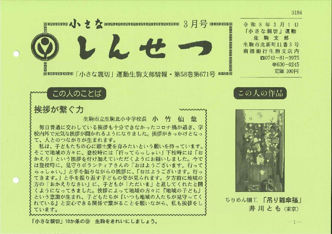 『小さなしんせつ』「小さな親切」運動生駒支部会報第58巻671号(2026年3月1日発行) -