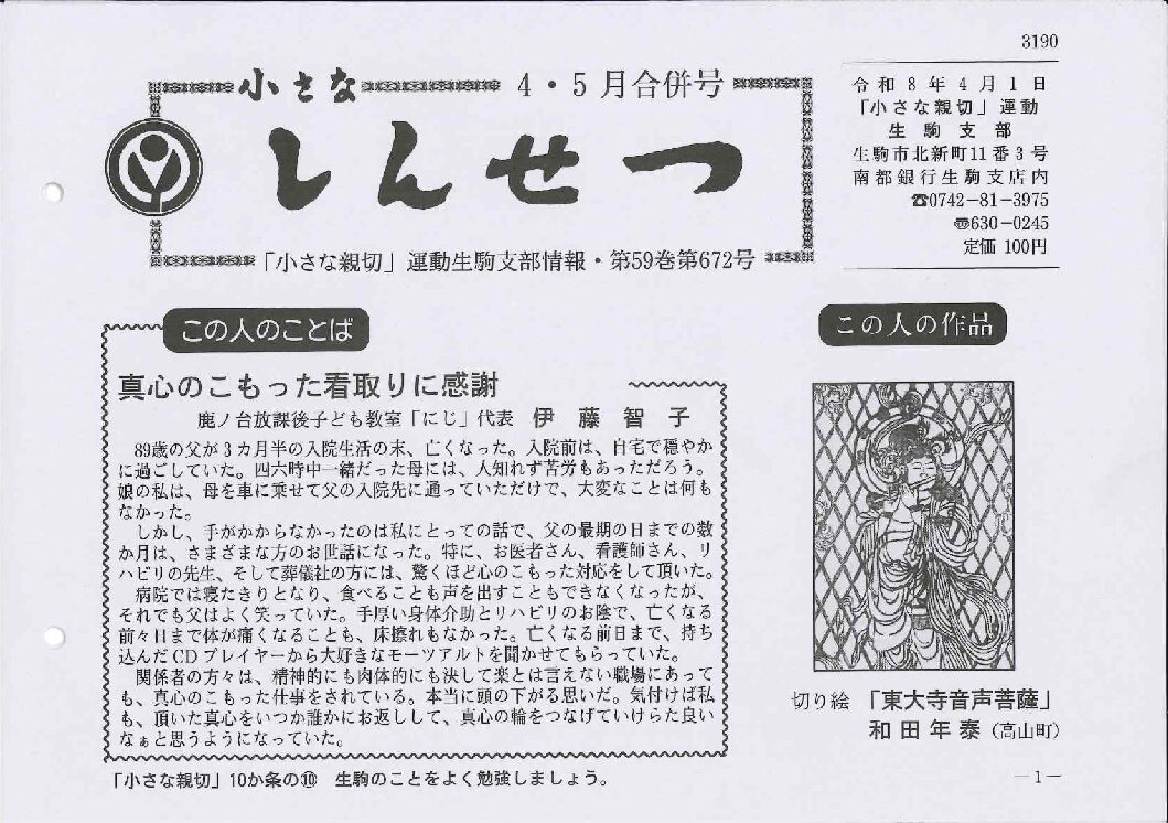『小さなしんせつ』「小さな親切」運動奈良県生駒支部会報第59巻第672号(2026年4月1日発行) -